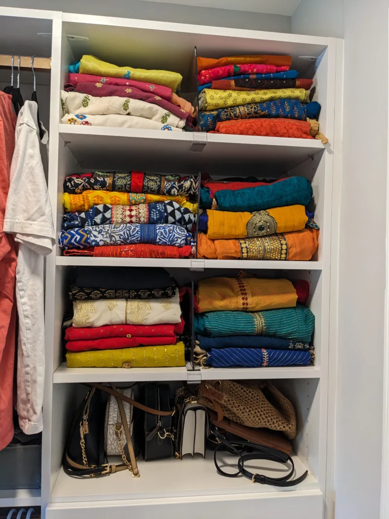 - Deep adjustable shelving for folded saris, dupattas, shawls, and heavy seasonal pieces.